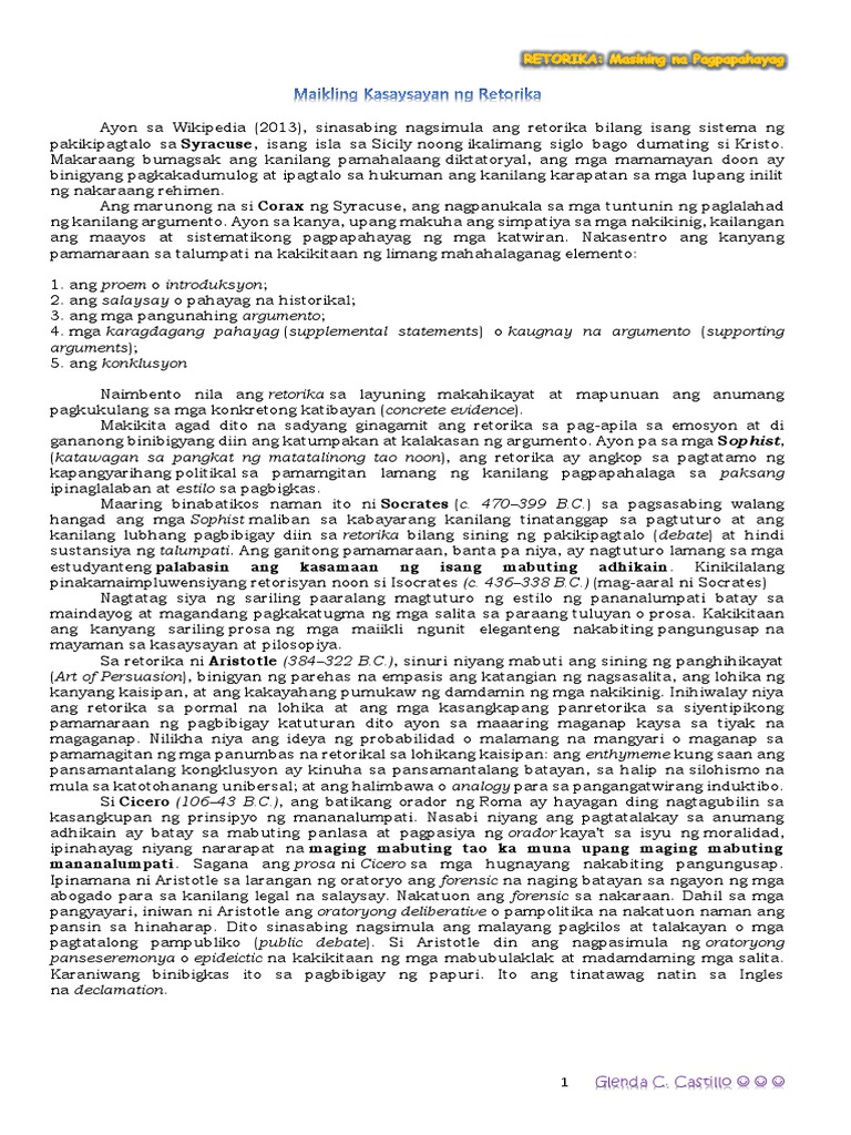 Maikling Kasaysayan Ng Retorika Lecture Pdf